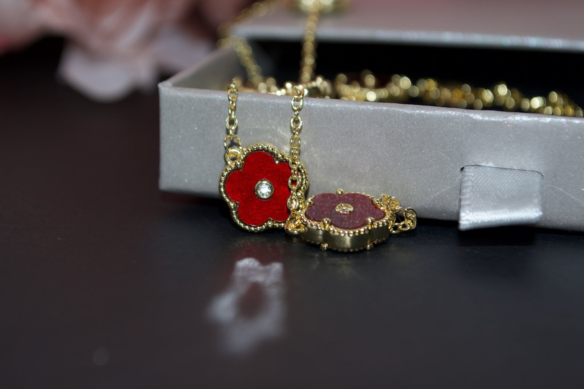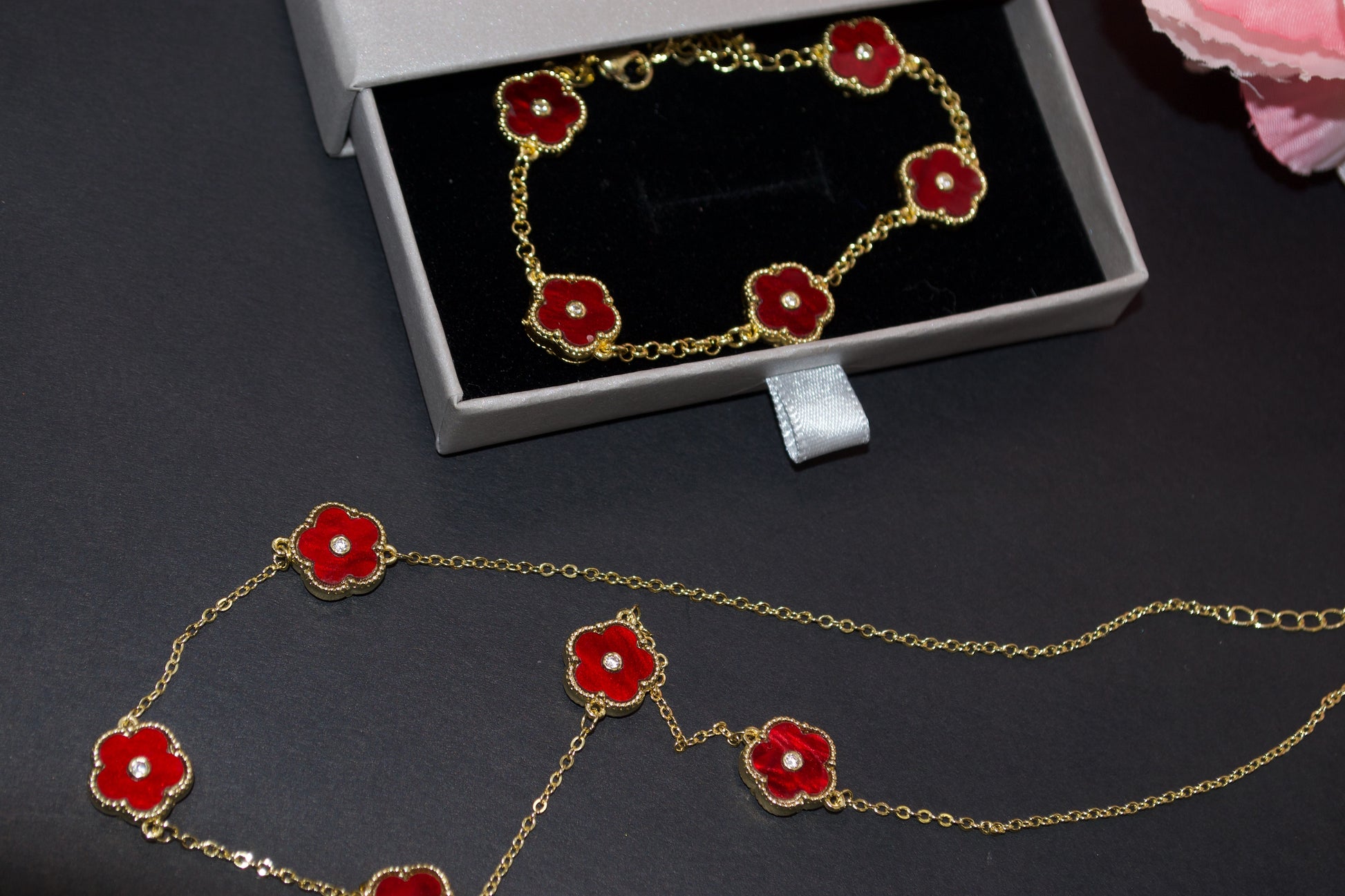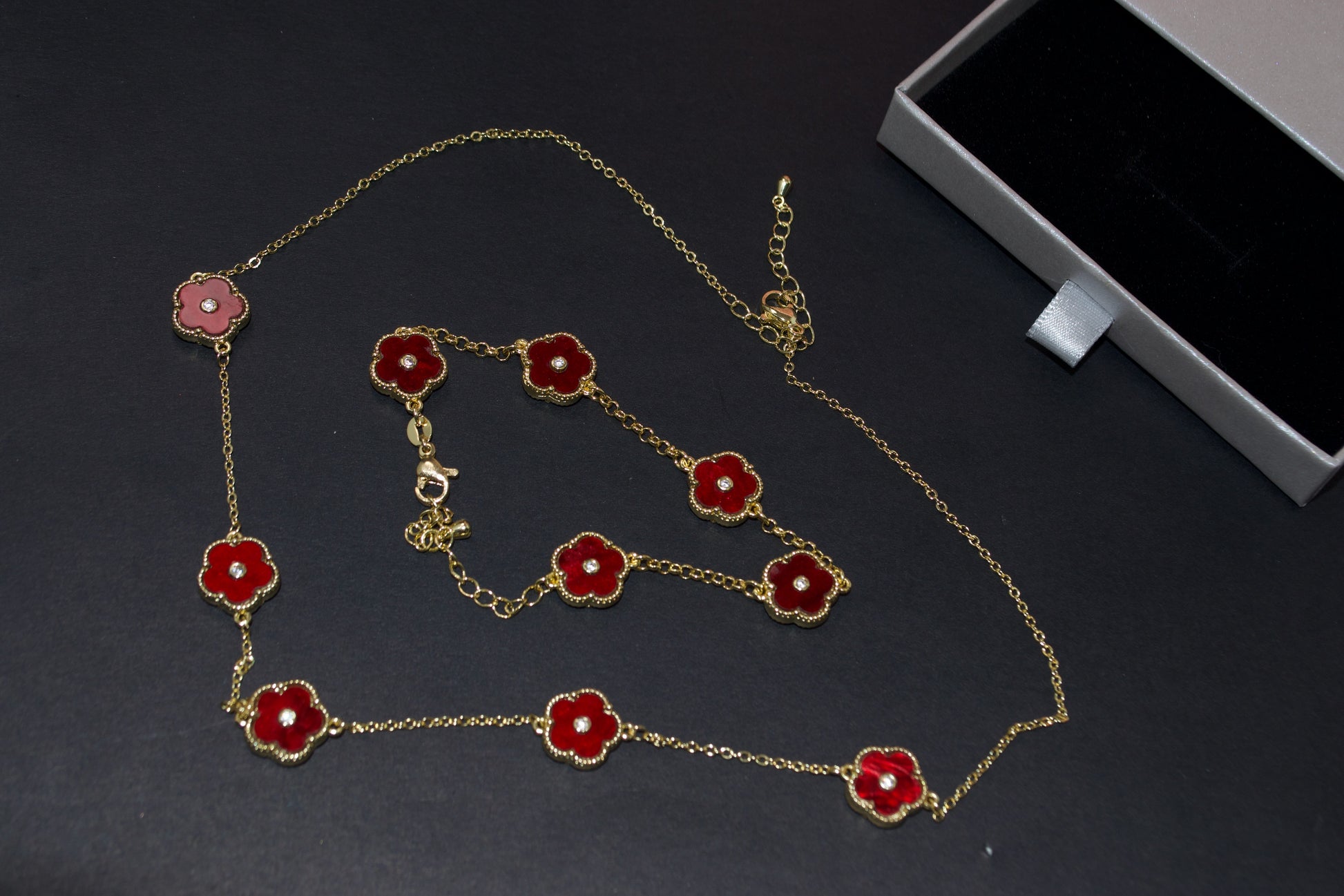 Necklace, Bracelet set. Trendy Style, Flower Charms - Red / Gold & Black / Gold. Adjustable length