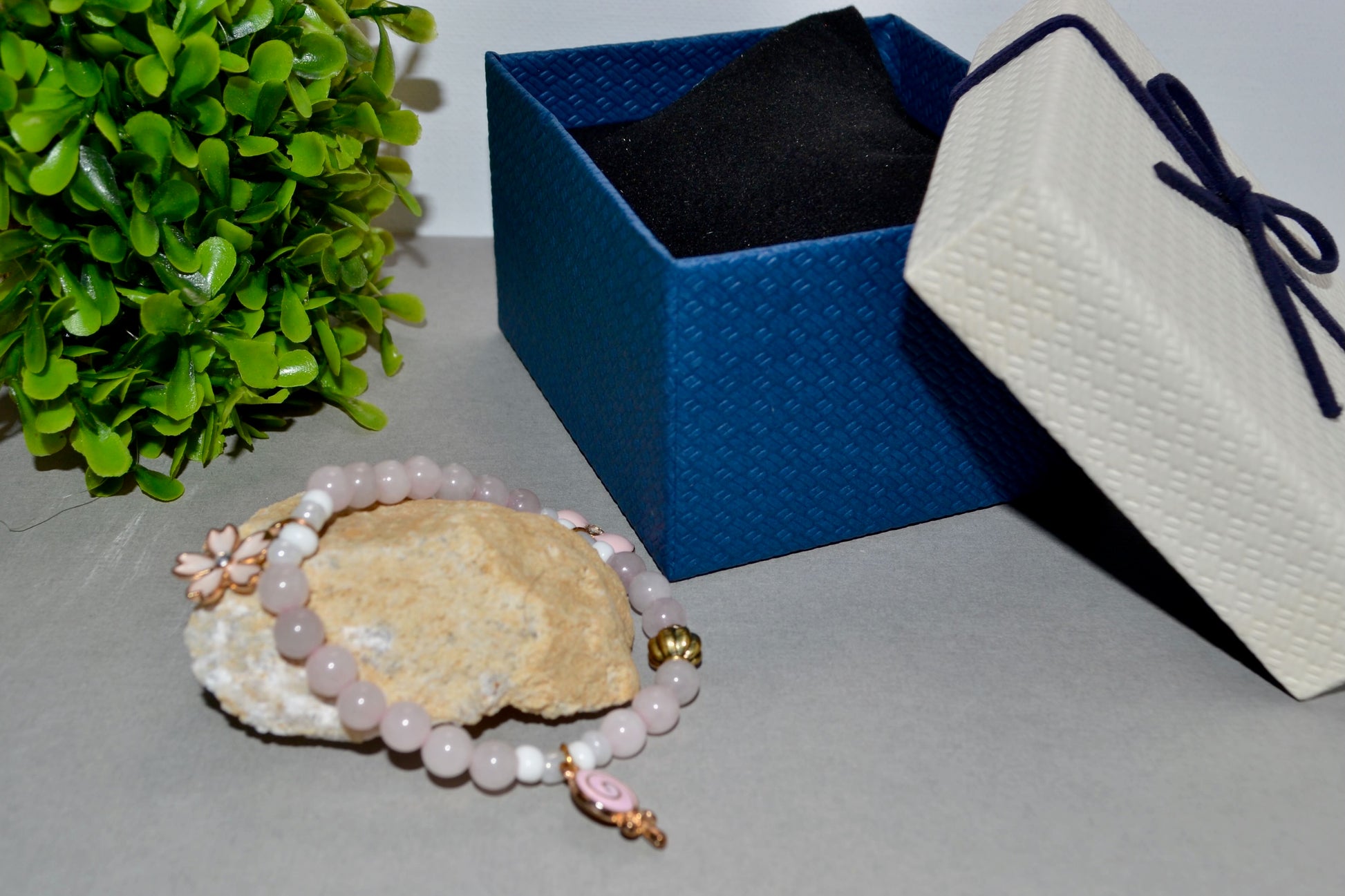 Cada pulsera está meticulosamente hecha a mano con cuentas de cuarzo rosa de 6 mm de alta calidad, conocidas por sus propiedades amorosas y curativas. Los suaves tonos rosados del cuarzo rosa evocan una sensación de compasión y curación emocional, lo que la convierte en la piedra perfecta para promover el amor propio y las relaciones armoniosas.