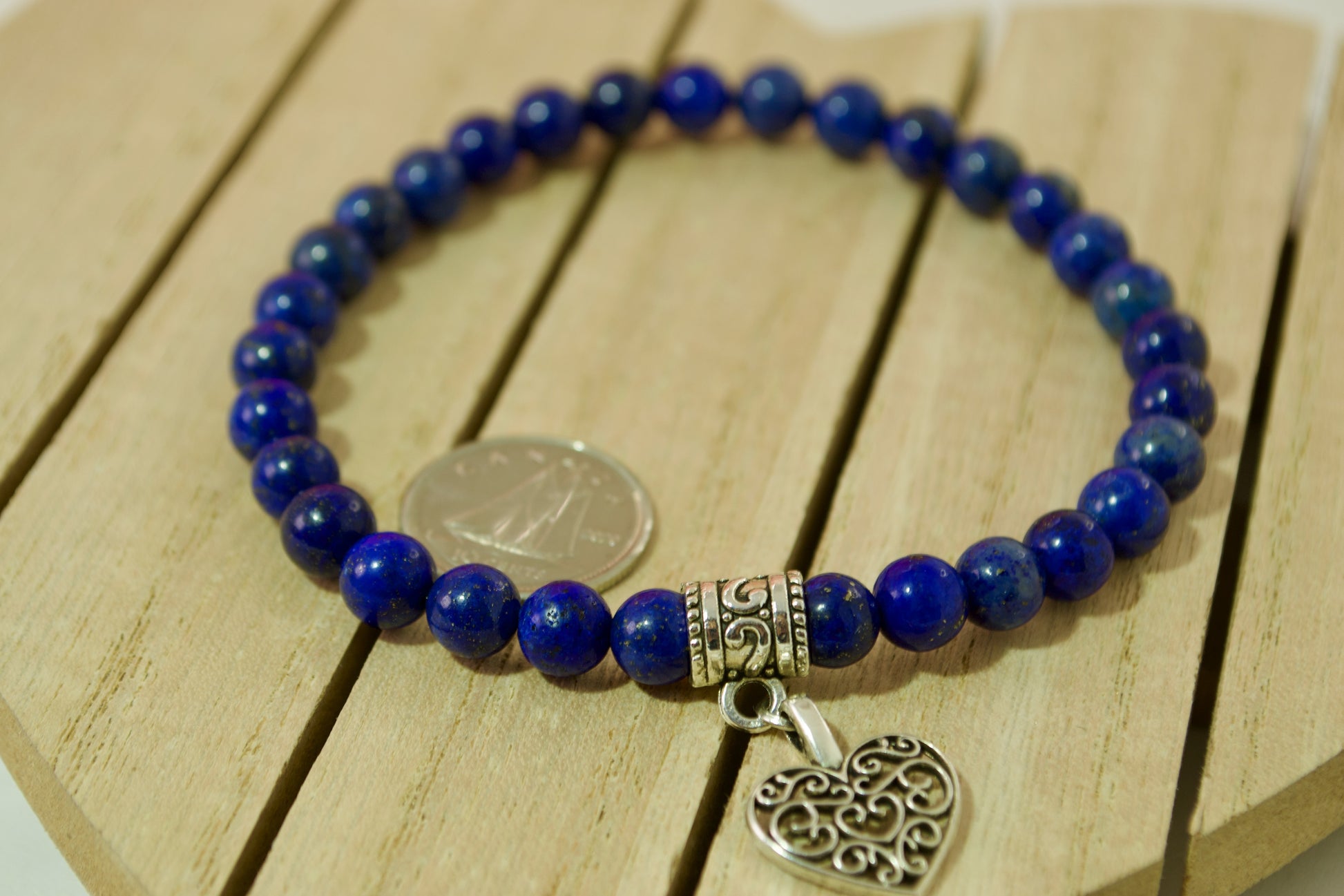 Cada pulsera está meticulosamente hecha a mano con cuentas de lapislázuli de 6 mm de alta calidad, conocidas por sus profundos tonos azules y sus propiedades espirituales. Se cree que el lapislázuli mejora la intuición, promueve la paz interior y estimula la mente, lo que la convierte en la piedra perfecta para quienes buscan una conexión con su yo superior.