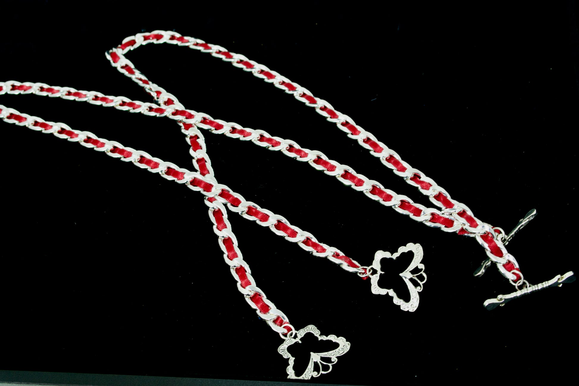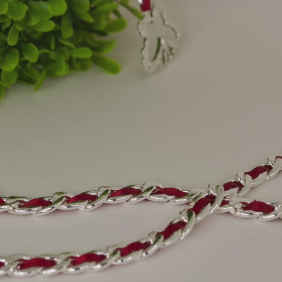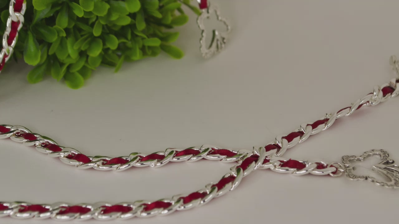 Collar de cadena barbada sin níquel bañado en plata con lazo rojo. Precioso cierre de mariposa.