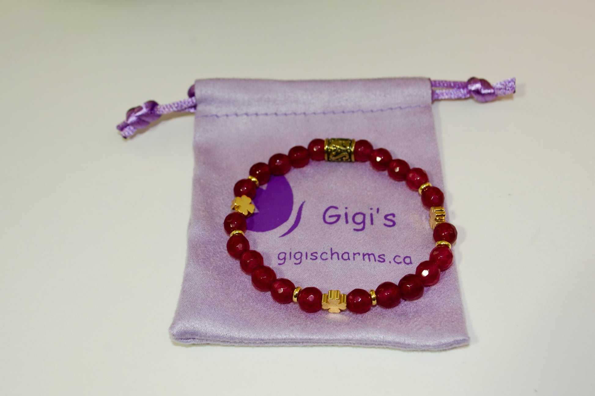 Impresionante pulsera de ágata roja facetada. Con 3 espaciadores de trébol chapados en oro, esta pieza hecha a mano por Gigi's es una verdadera declaración de estilo.