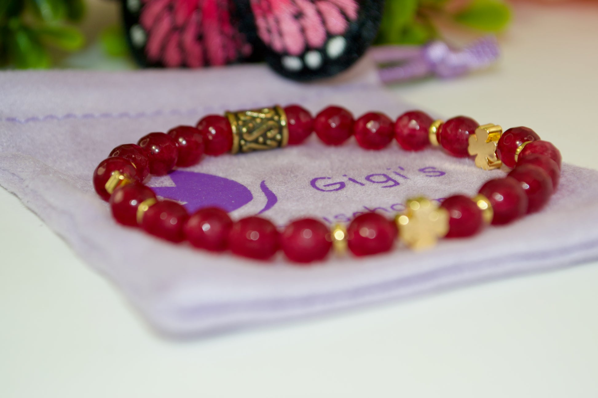 - Material: cuentas de ágata facetada roja, espaciador de trébol chapado en oro.