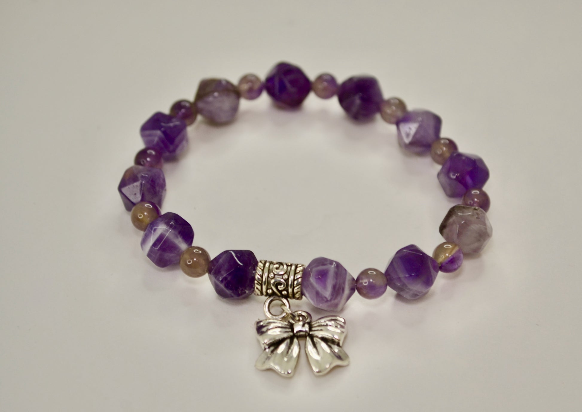 Presentamos nuestra exquisita pulsera con lazo de amatista hecha a mano, una impresionante pieza de joyería que combina elegancia y propiedades curativas. Esta hermosa pulsera presenta cuentas de amatista genuinas en dos tamaños, de 6 mm con acabado redondo y de 10 mm con un acabado facetado que agrega un toque de brillo a tu muñeca.